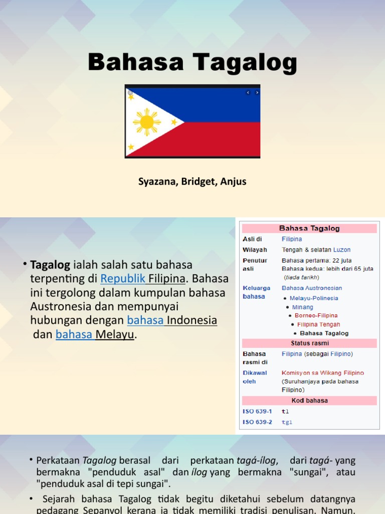 Bahasa Tagalog Filipino adalah bahasa resmi di negara Filipina bahasa Tagalog hanya dipergunakan oleh penduduk Filipina. Bahasa yang diangkat sebagai bahasa nasional Filipina itu disebut dengan bahasa Tagalog tetapi ditambahkan dengan kosa kata yang berasal dari bahasa Spanyol dan Inggris menjadi bahasa.